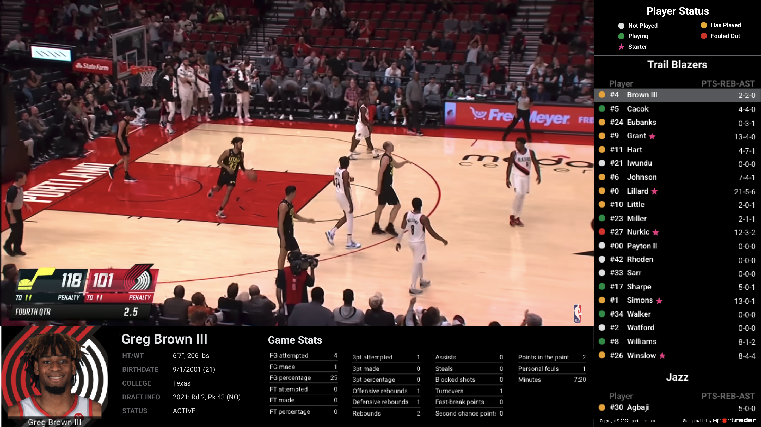 Additionally, we added in other types of feedback to help end users follow the game easier while viewing the broadcast app stats. I applied colors to indicate that a player is 'Playing', 'Has Played', 'Has Not Played', and 'Fouled Out'. I wanted users to be able to glance on the roster list and quickly see the status of each player without having to navigate anywhere on screen.