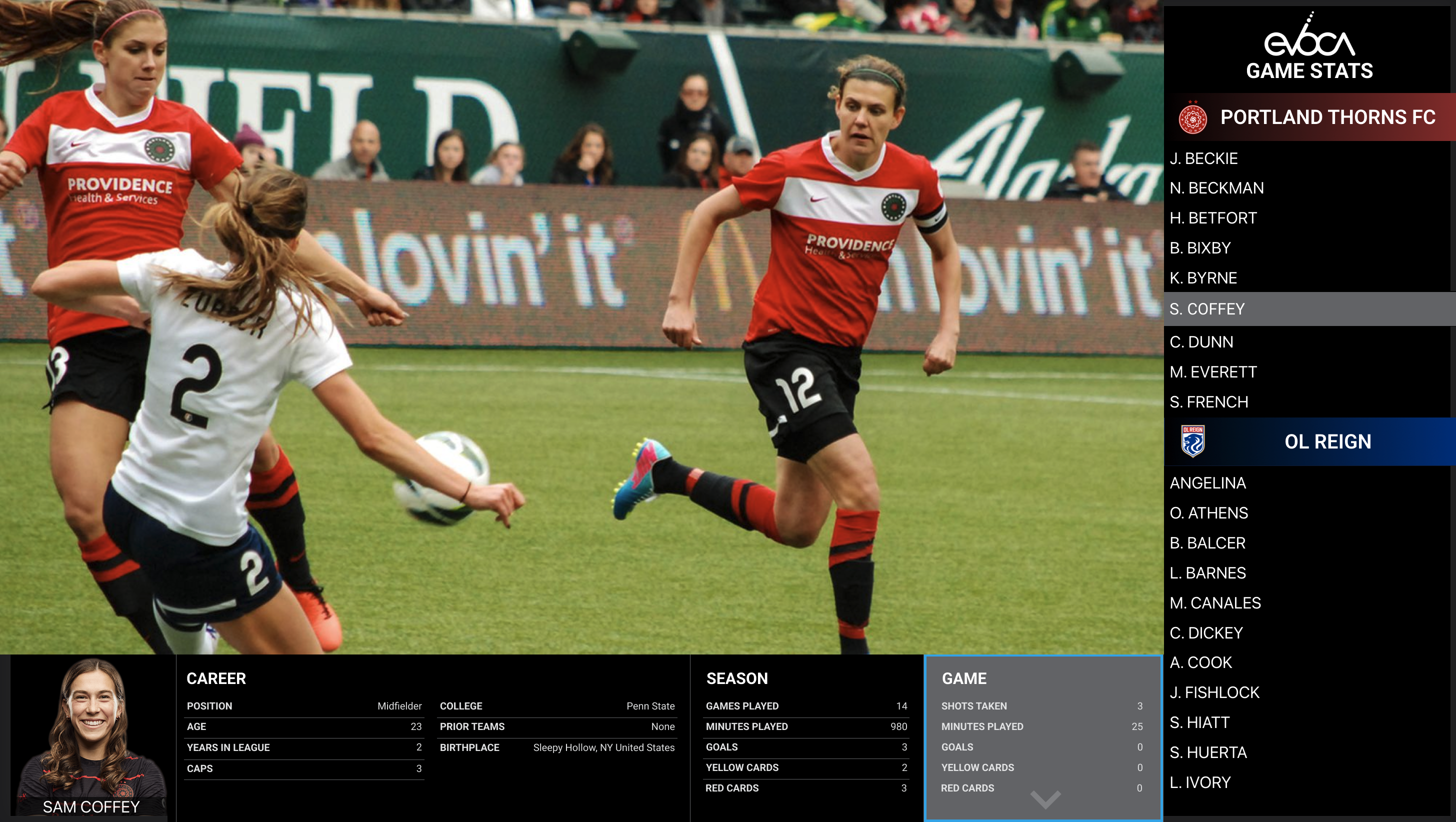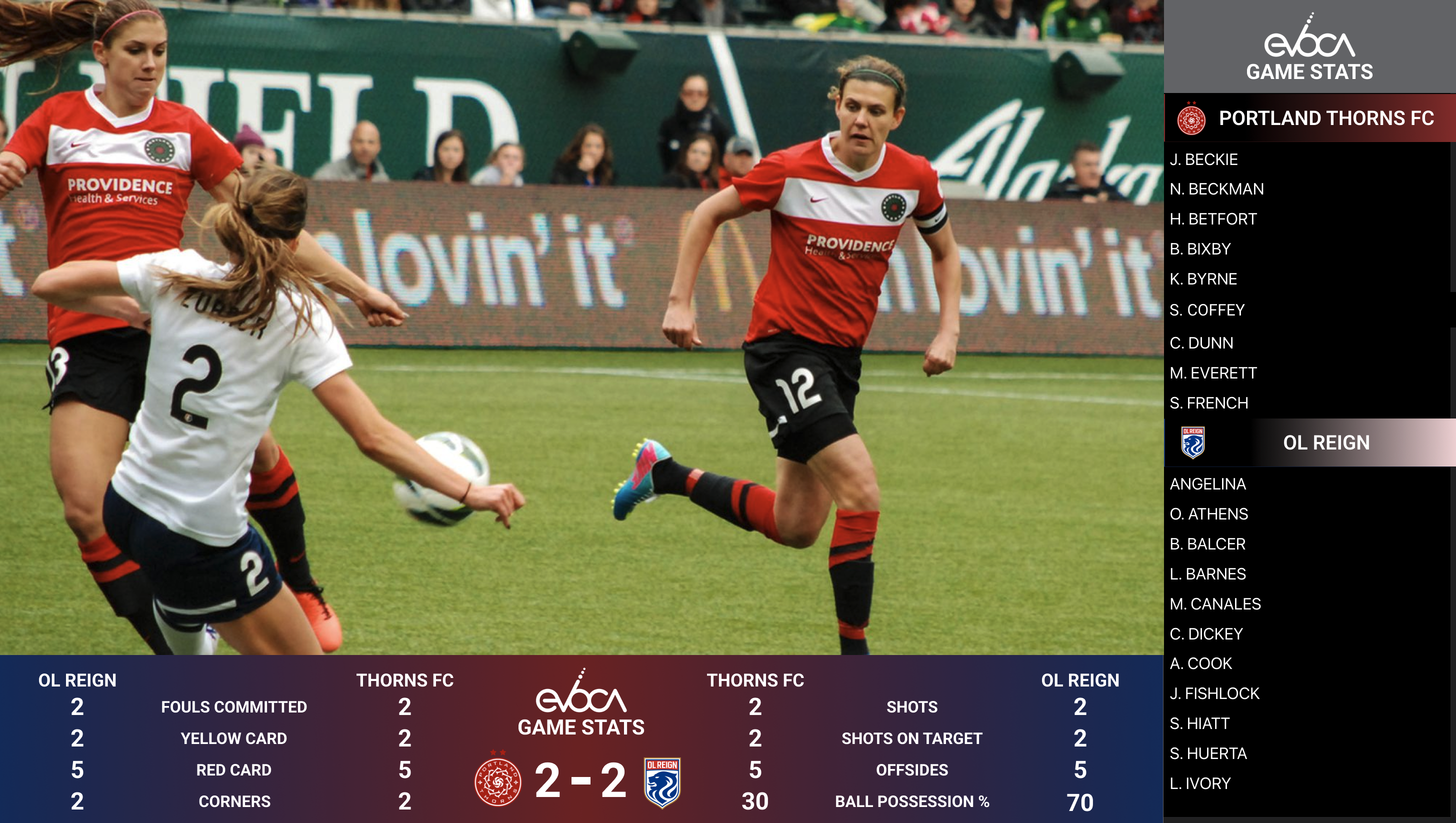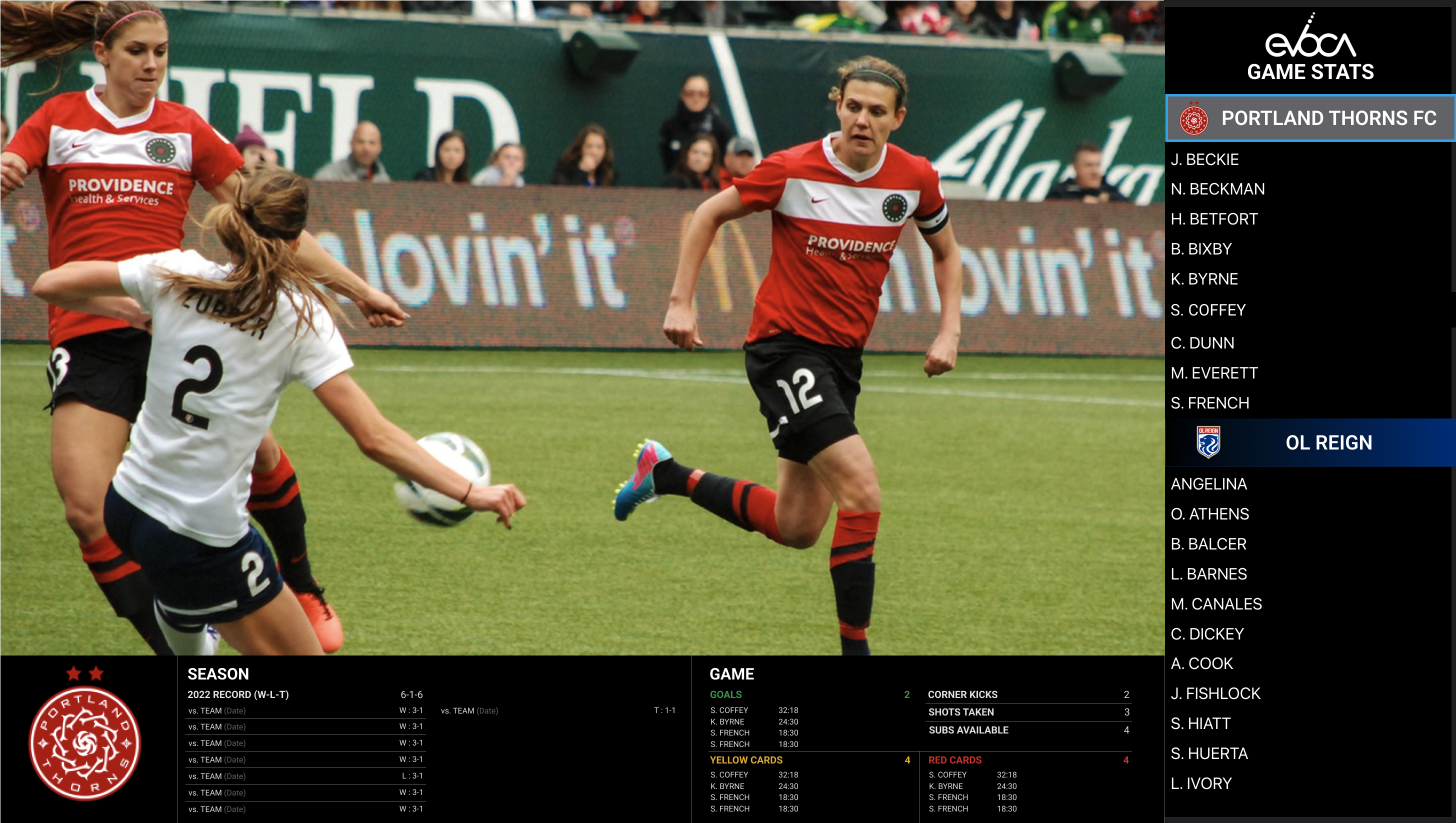 As the seasons for both NWSL and NBA progress, we continued making changes based on feedback and how the app performed on our devices. For instance, I altered to font family and weight to help with readability after viewing on smaller TVs. I also tried to go with a dark/flat theme overall to help make sure the stats or color indicators drew your eye. This type of application technology is in its infancy and will continue to grow and become better but for a first implementation in this space, I am very proud of what we provided our end users.