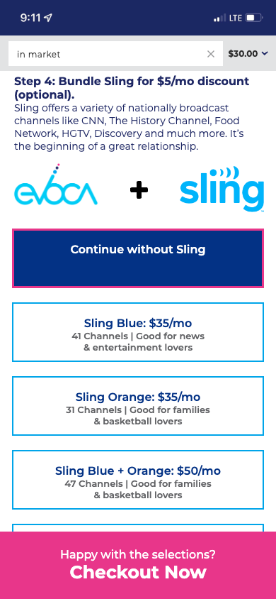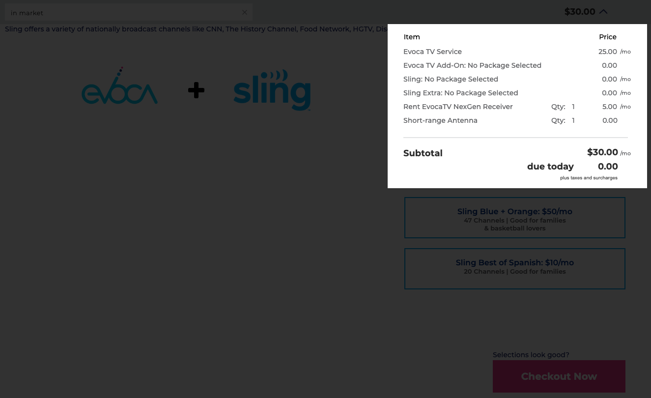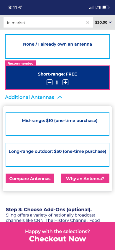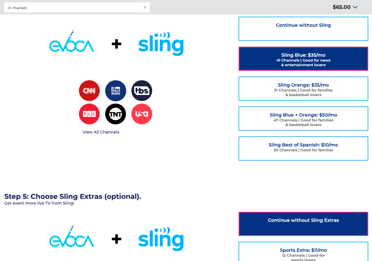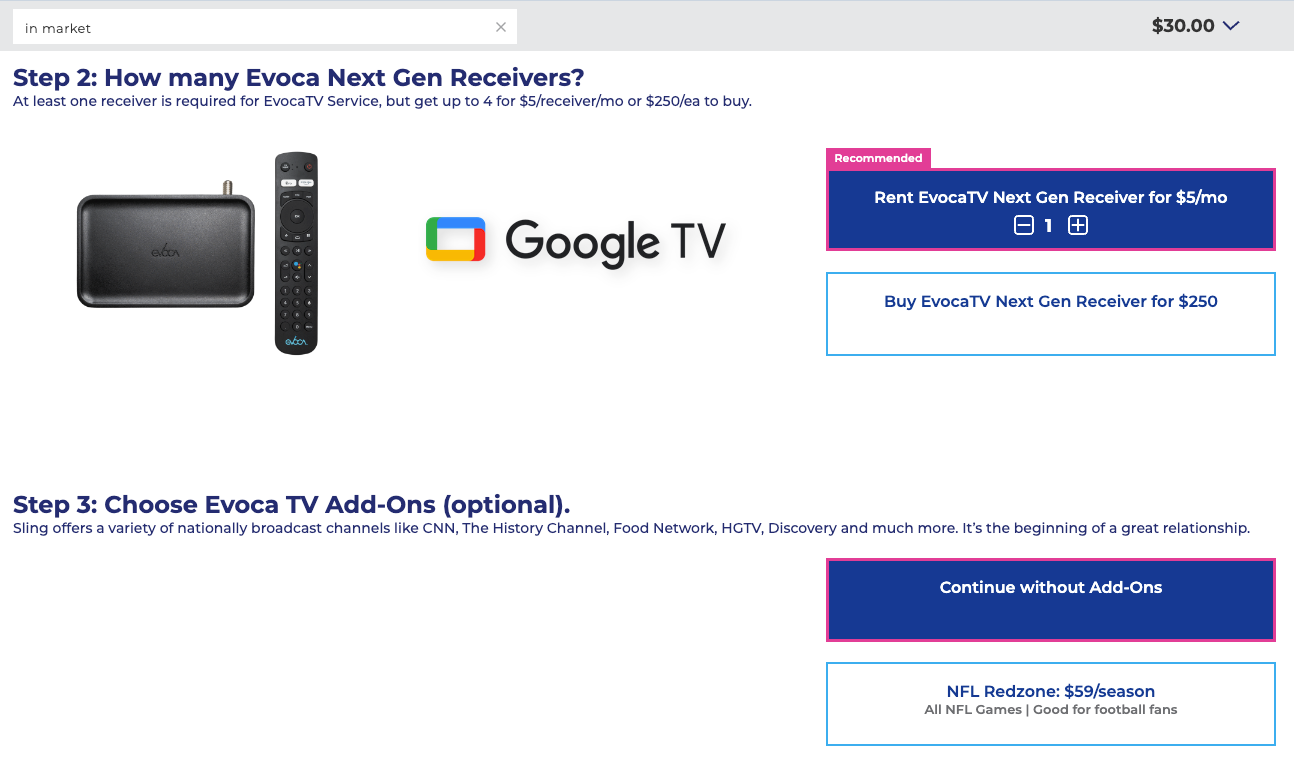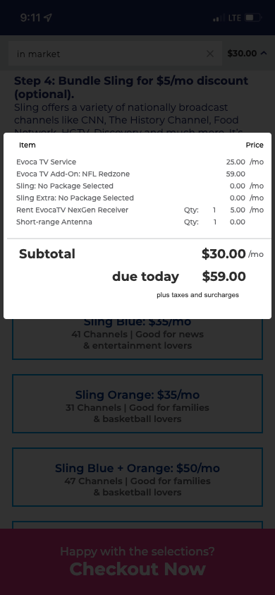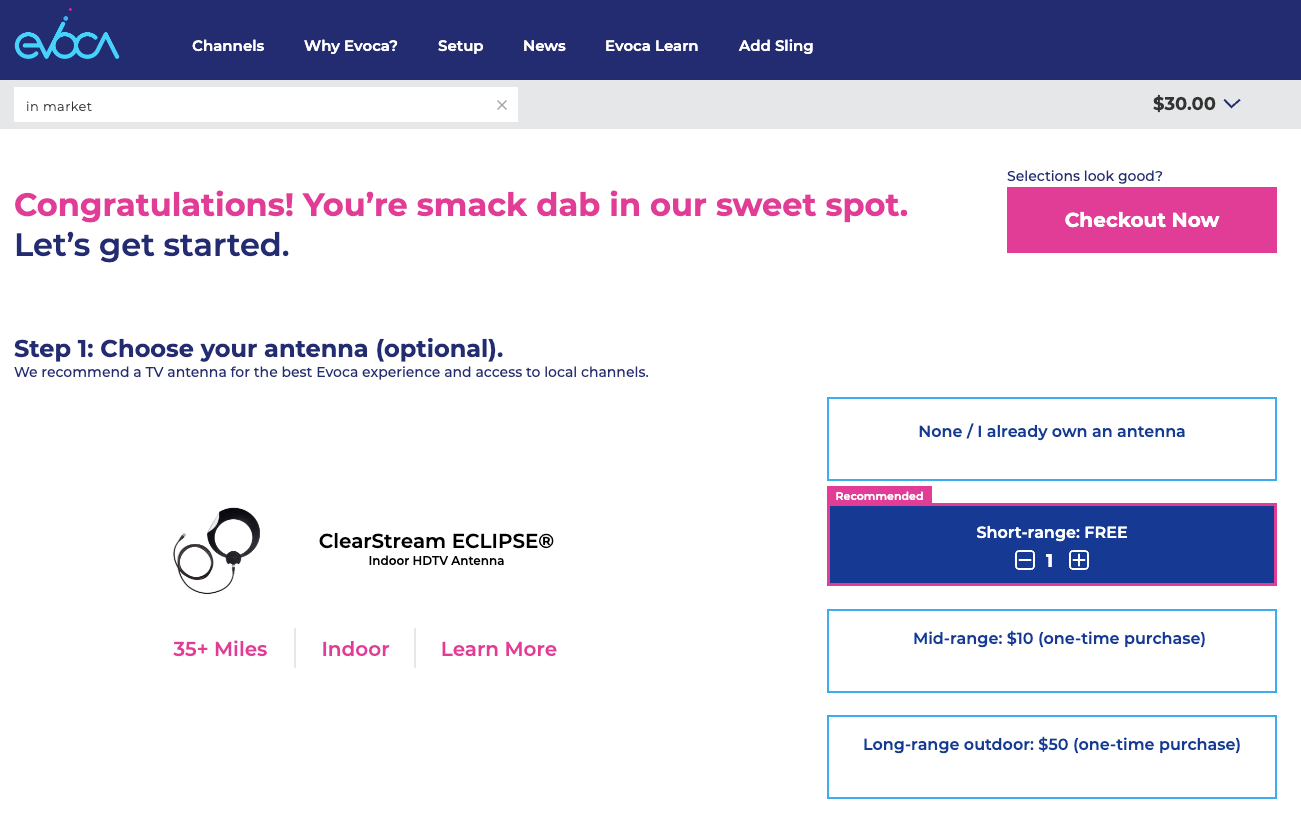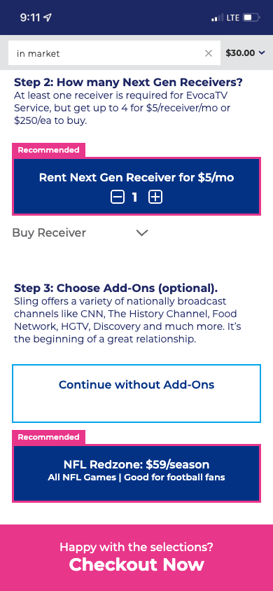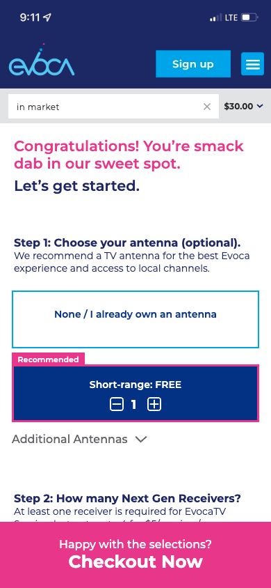 An always visible checkout button is also added to provide users a click through option that selects the recommended selections without having to manually make selections. This option utilizes their address and relative location to Evoca towers for the best antenna option for optimal over the air experience.