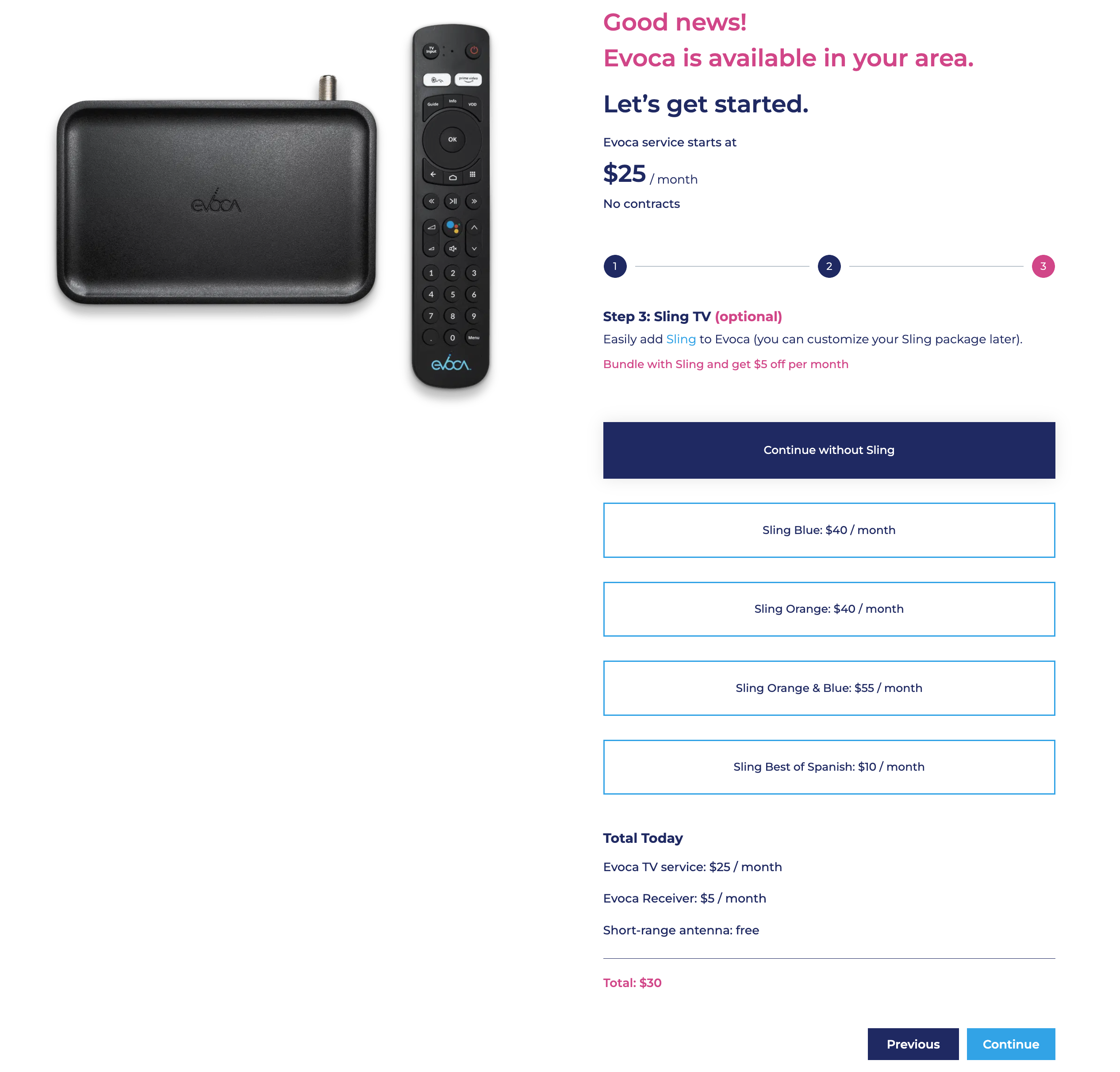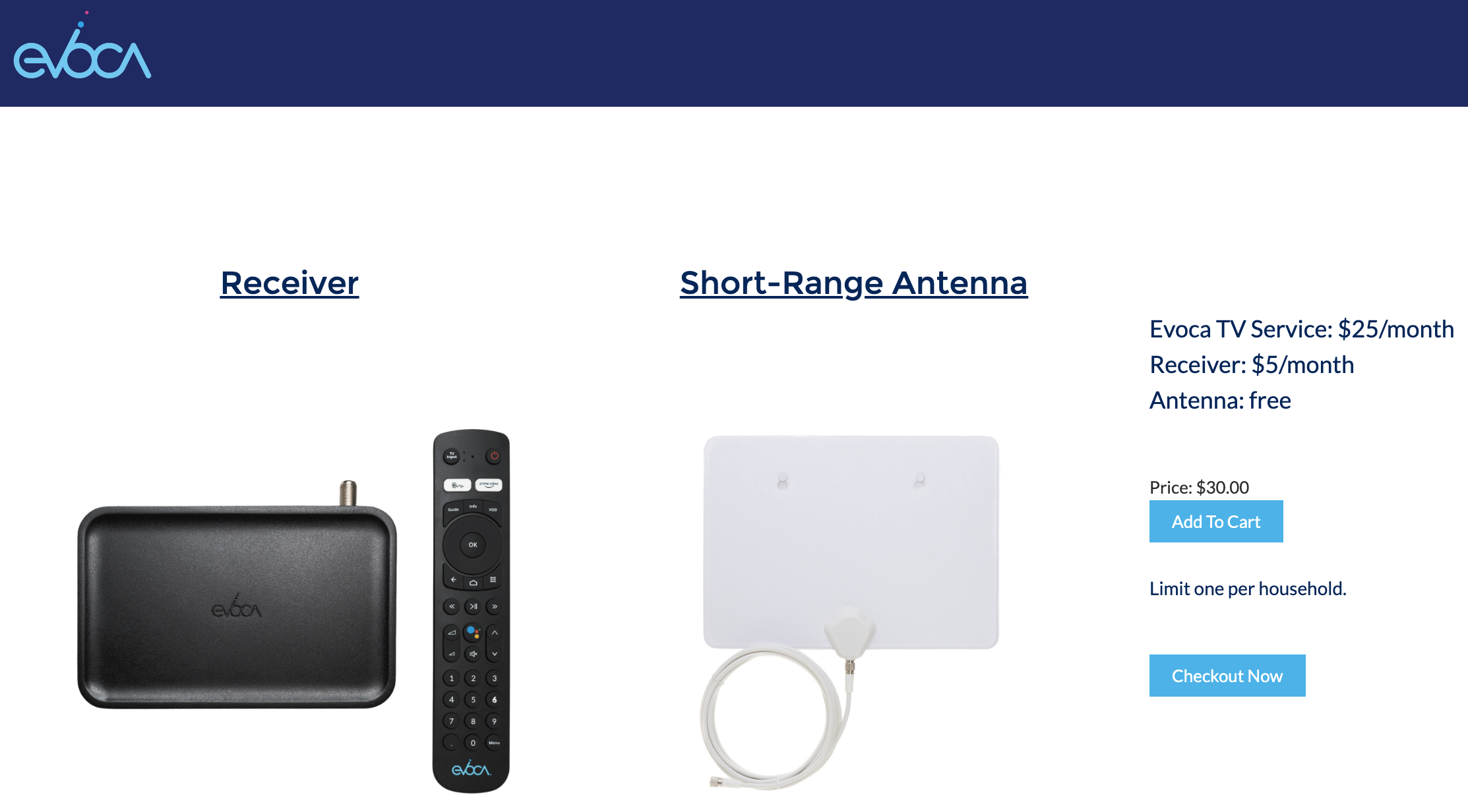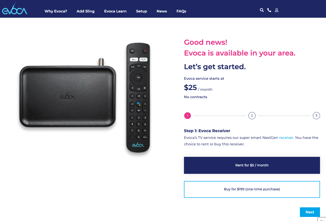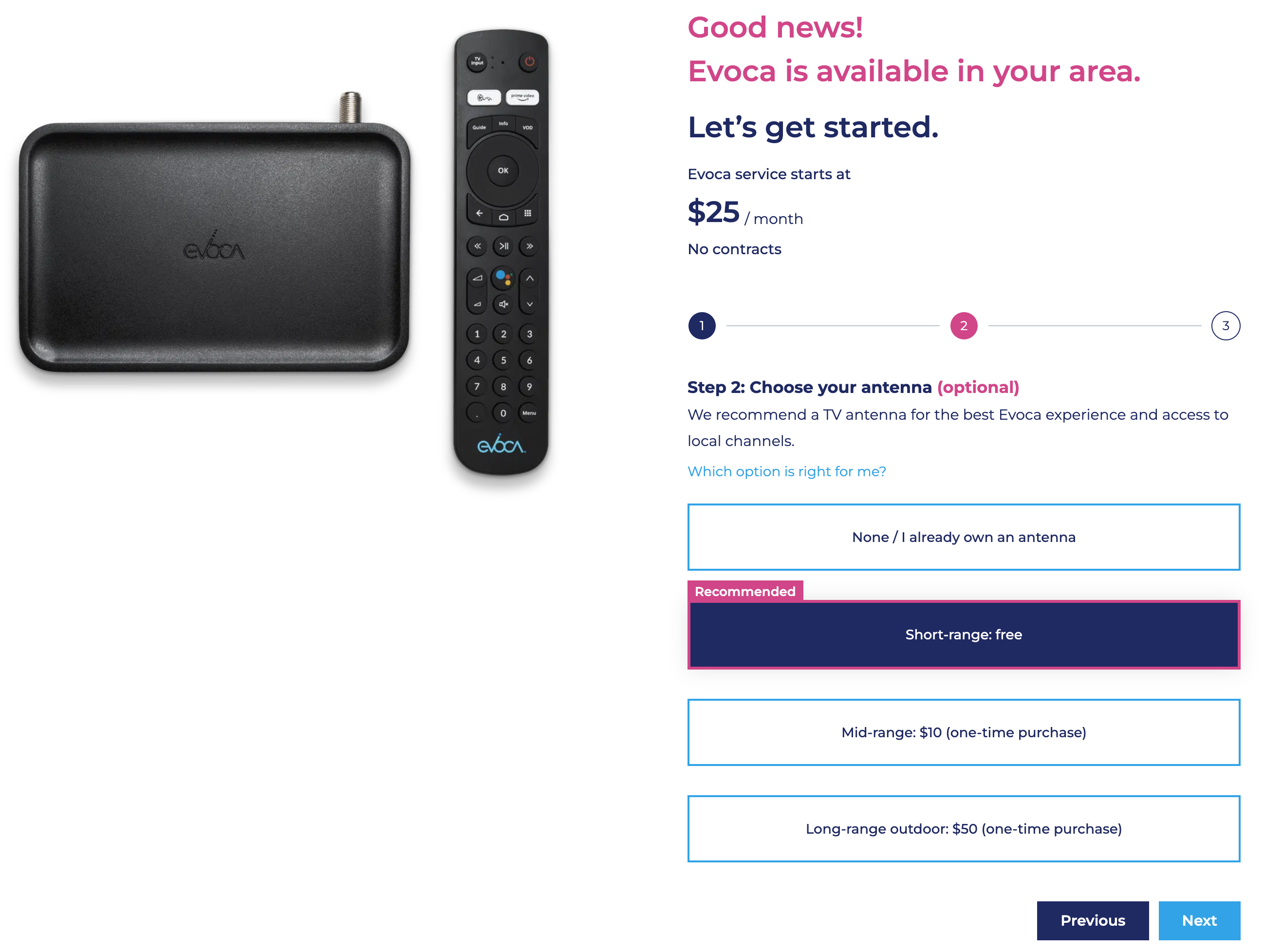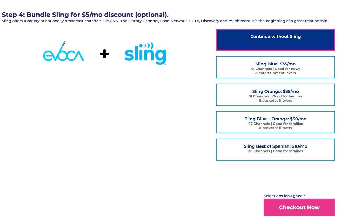 An always visible checkout button is also added to provide users a click through option that selects the recommended selections without having to manually make selections. This option utilizes their address and relative location to Evoca towers for the best antenna option for optimal over the air experience.